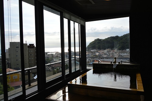 最後に朝風呂へ。奥に見える海が光って綺麗です。
