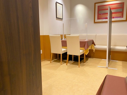 テーブル上にも透明なパーテンションがあり、マスク入れも用意されていました。