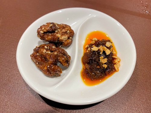 お通し?の「胡桃の飴炊き」に「特製おかず辣油」