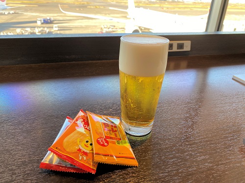 飛行機を眺めながらのビール。