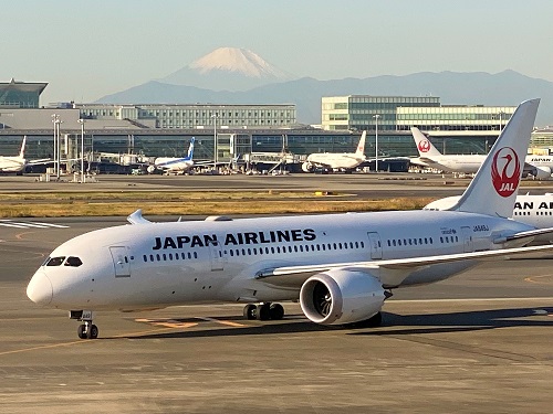 この日は快晴で、飛行機の向こうに綺麗な富士山が。