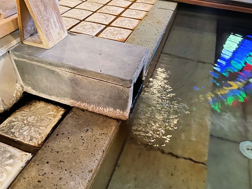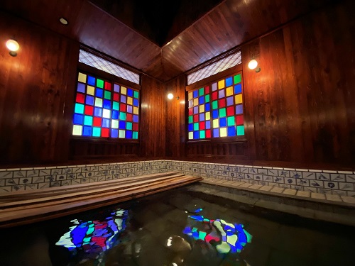 湯面にステンドグラスの光がゆらゆらと輝き幻想的な雰囲気。