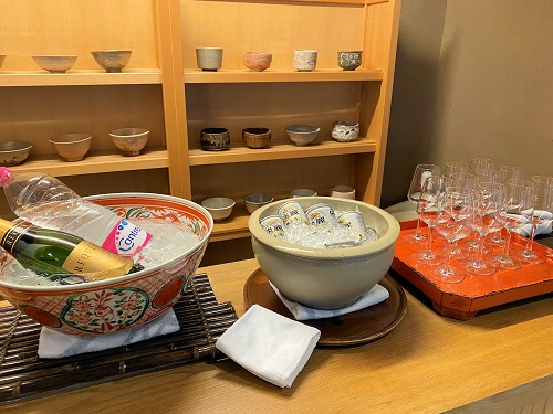 お風呂上りにはスパークリングワインと発泡酒、コントレックスがセルフで頂けます。