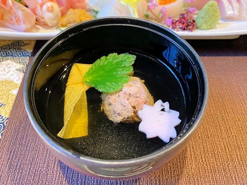 「吸い物 タコ、鶏つみれ、花麩、湯葉」
