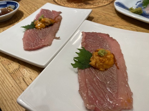 雲丹と国産牛の炙り。肉がとろけて美味しい。