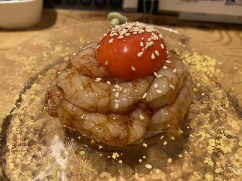 濃厚な漬の海老に黄身をとろ~りとかけて。