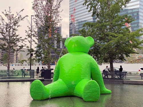 腹ごなしの散歩。途中、ビルの谷間の水辺にドでかい緑色のクマが。