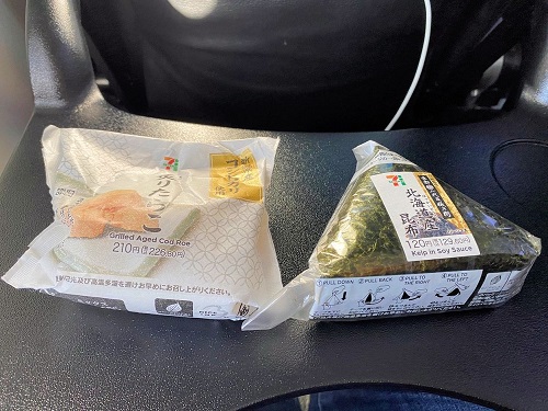 朝ご飯は機内でコンビニお握り。