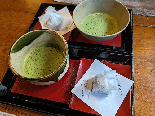 庭を眺めながらウエルカム抹茶と和菓子を頂きます。