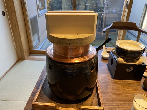 銅釜で部屋で炊くご飯は有機米こしひかり。