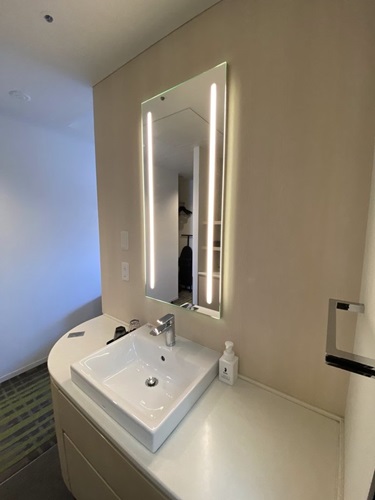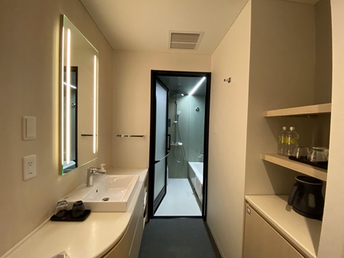 バスルームと洗面台、冷蔵庫がコンパクトに収まったスペース。