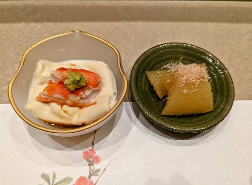 先付けは蟹が乗った湯葉と数の子。