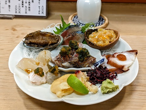 「アワビの稚貝煮・〆鯖の炙り・鰺のたたき・平目のこぶ締めと縁側・北寄貝の炙り・たこの梅肉和え・いか雲丹」
