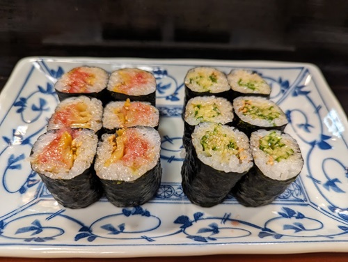 左が「栄巻き」ネギトロにみじん切りの沢庵とごま油を和えたお店の名物。