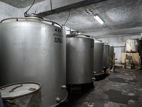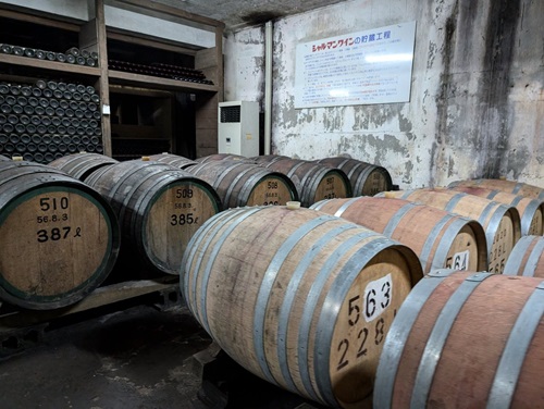 急な階段を降りると地下には樽が並ぶ貯蔵庫がありました。