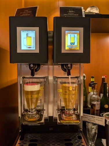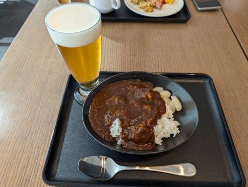 マシンの力を借りた生ビールとJALカレーの朝ごはん。