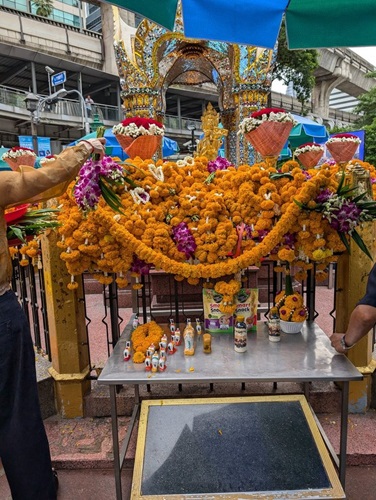 祀られている四面体のブラフマー神は花に埋もれんばかりに。