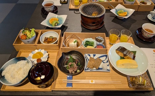 みかんジュース飲み比べがあるのが愛媛らしい和朝食。