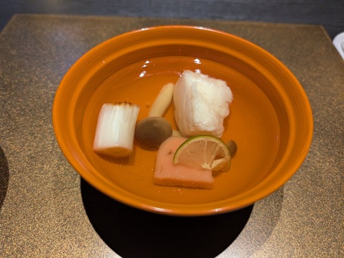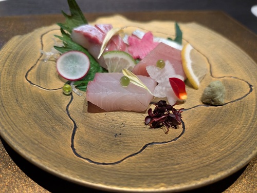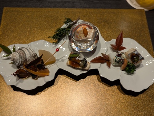 醤油で炊いたサザエやイカの和え物など、前菜5品。