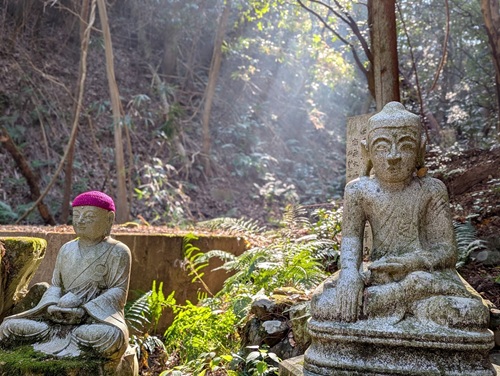 木漏れ日を浴びる仏像が幻想的な雰囲気。