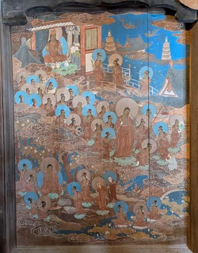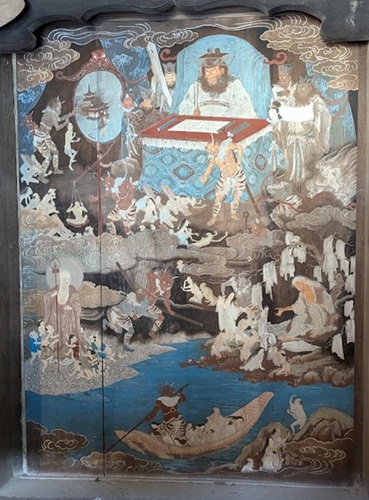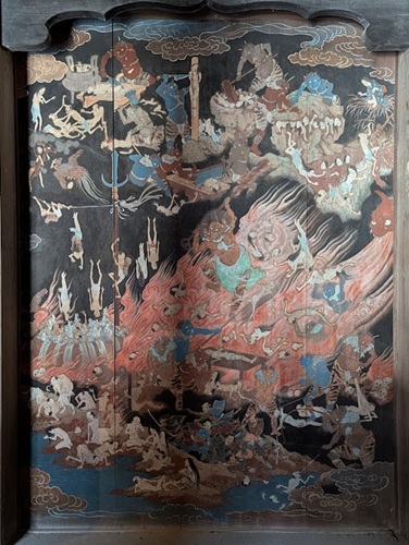 格子越しに見える壁には掛けられているのは地獄極楽図。