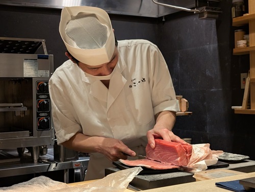 まぐろの塊を切り出す大将。