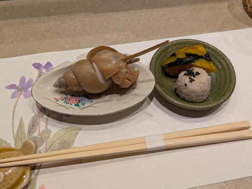 先付はバイ貝と海老芋、かぼちゃ。
