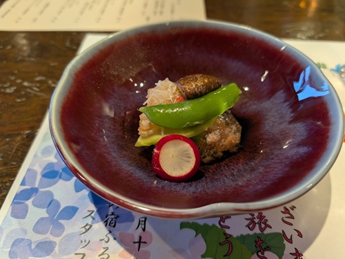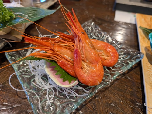 宿の方が本日のお勧め食材をお盆に載せて来たので、右端の縞海老を頼んでみました。