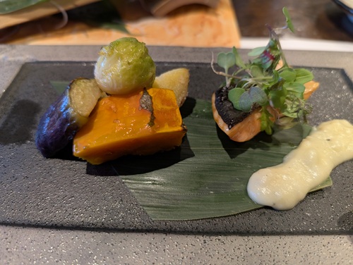 北海道産グリーンアスパラとズワイガニのミルフィーユ。