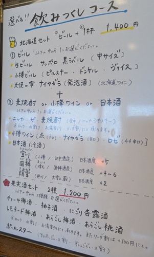 ビール3種類から1杯、麦焼酎・小樽ワイン・日本酒から1杯選べます。